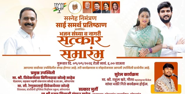 कोपरगाव प्रतिनिधी, दि. ३० : कोपरगाव शहर व तालुक्यातील सर्व नागरिकांना नवीन वर्ष २०२६ च्या हार्दिक शुभेच्छा देत, नवीन वर्षाची नवी सुरुवात सन्मान, सेवा आणि भक्तीच्या भावनेतून व्हावी, या उद्देशाने साई समर्थ प्रतिष्ठान, कोपरगाव यांच्या वतीने गुरुवार, दिनांक १ जानेवारी २०२६ रोजी नवनिर्वाचित नगराध्यक्ष पराग संधान आणि नगरसेवक उमेदवार यांचा नागरी सत्कार व भजन संध्याचे आयोजन करण्यात आले आहे.
